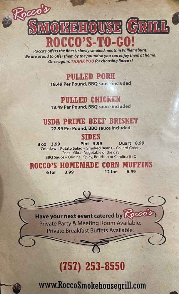 Rocco's Smokehouse Grill in Williamsburg, VA, is a go-to spot for delicious New American Barbeque. This restaurant offers a diverse range of amenities, from outdoor seating to free Wi-Fi, making it a comfortable dining experience for all. Customers rave about the generous portions and affordable prices, with standout dishes like ribs, smoked chicken, and pulled pork leaving diners satisfied. The attentive service and welcoming atmosphere add to the overall appeal of this establishment. Whether you're a fan of classic BBQ or looking to try something new, Rocco's Smokehouse Grill is a must-visit destination. Don't forget to save room for dessert – their cakes are a standout favorite among customers. Plan your next meal at Rocco's for a memorable dining experience.