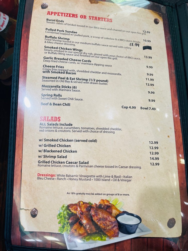 Slowly smoked in our special dry rub, glazed with BBQ sauce, and finished on our open fire grill.